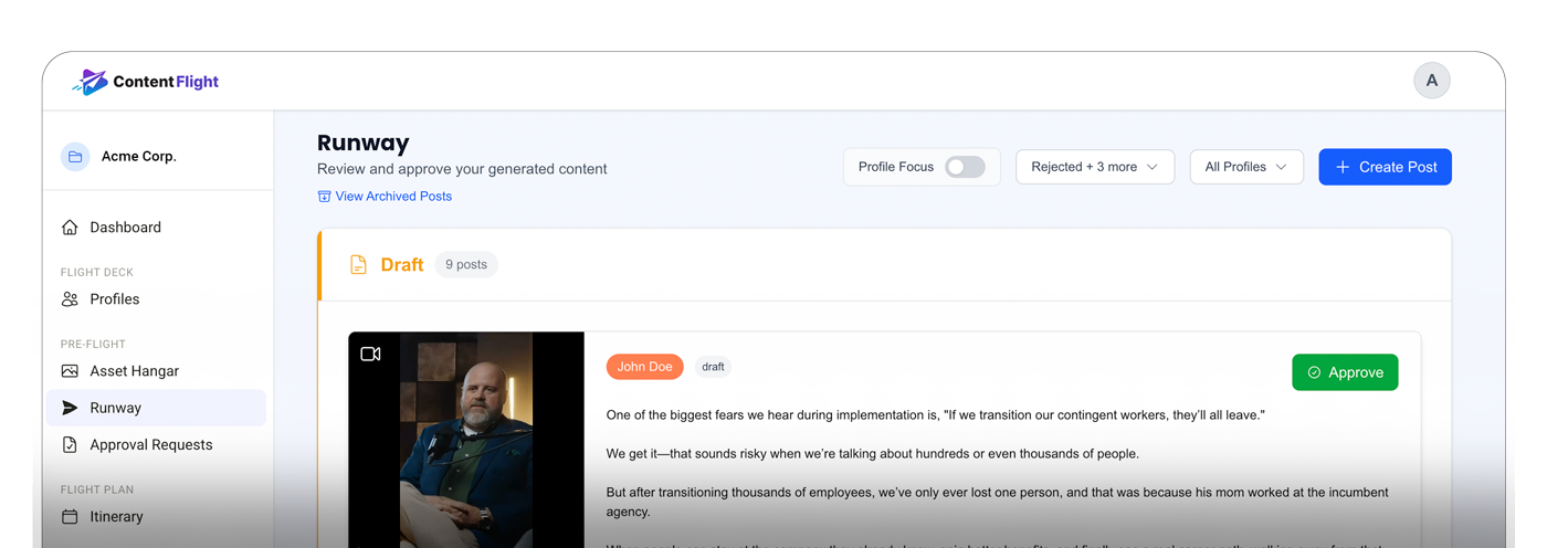 Use videos, images, transcripts, or text to generate posts across your entire team. Content Flight applies each person's Voice Signature so content sounds authentic, even when it comes from shared source material.